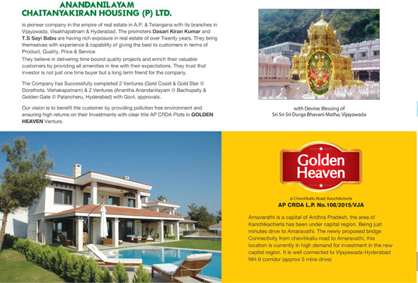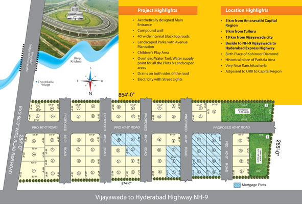 The Layout “Golden Heaven” is accompanied with set of distinct features and highlights. It’ll be one of the best & first few residential layouts among in and around Vijayawada and Amaravathi. Golden Heaven will set new trends and be complimented for what it’s thought –