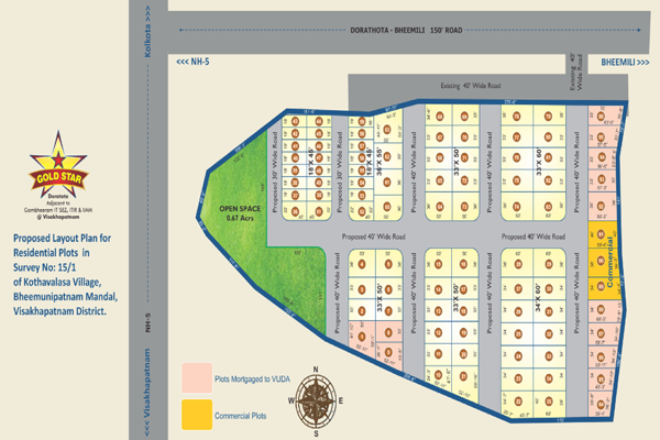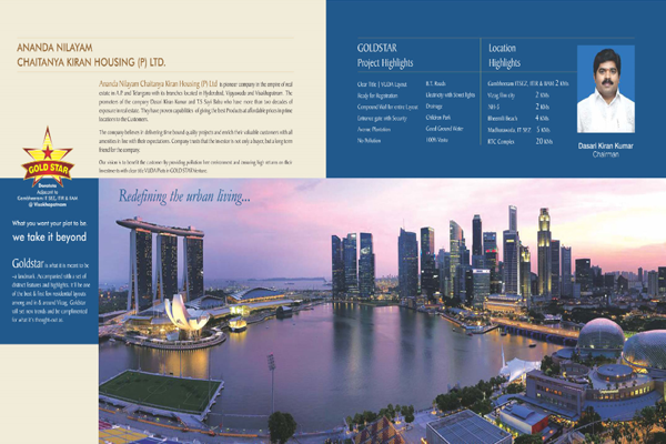Goldstar is what it is meant to be - a landmark. The layout is accompanied with a set of distinct features and highlights. it'll be one of the best & first few residential layouts among in & around vizag. Goldstar will set new trends and be complimented for what it's thought - out as.
